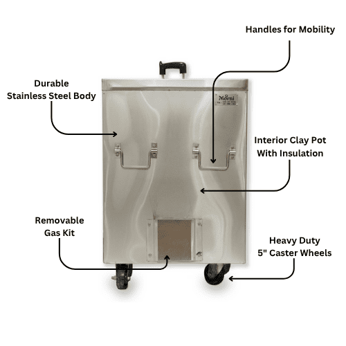 Mounted on four heavy-duty wheels, including two front castors with brakes, this portable tandoor is ideal for restaurants, catering businesses, and outdoor cooking enthusiasts. Its compact design ensures easy movement while maintaining the robust performance of a professional-grade tandoor.